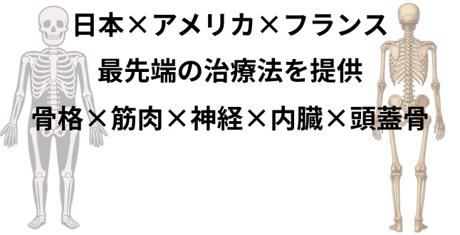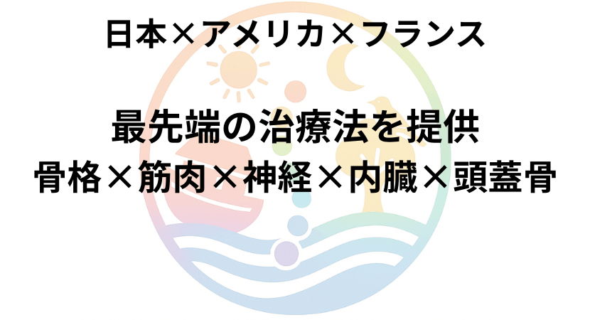 当院では、日本・アメリカ・フランスの最先端の手技療法を組み合わせ、幅広い症状に対応しています。筋肉・骨格・神経・内臓・頭蓋骨など、全身を総合的に整えることで、根本からの改善を目指します。豊富な臨床経験と確かな知識をもとに、お子さまからご高齢の方まで、どんな年齢にも安心して受けていただける施術を行っています。